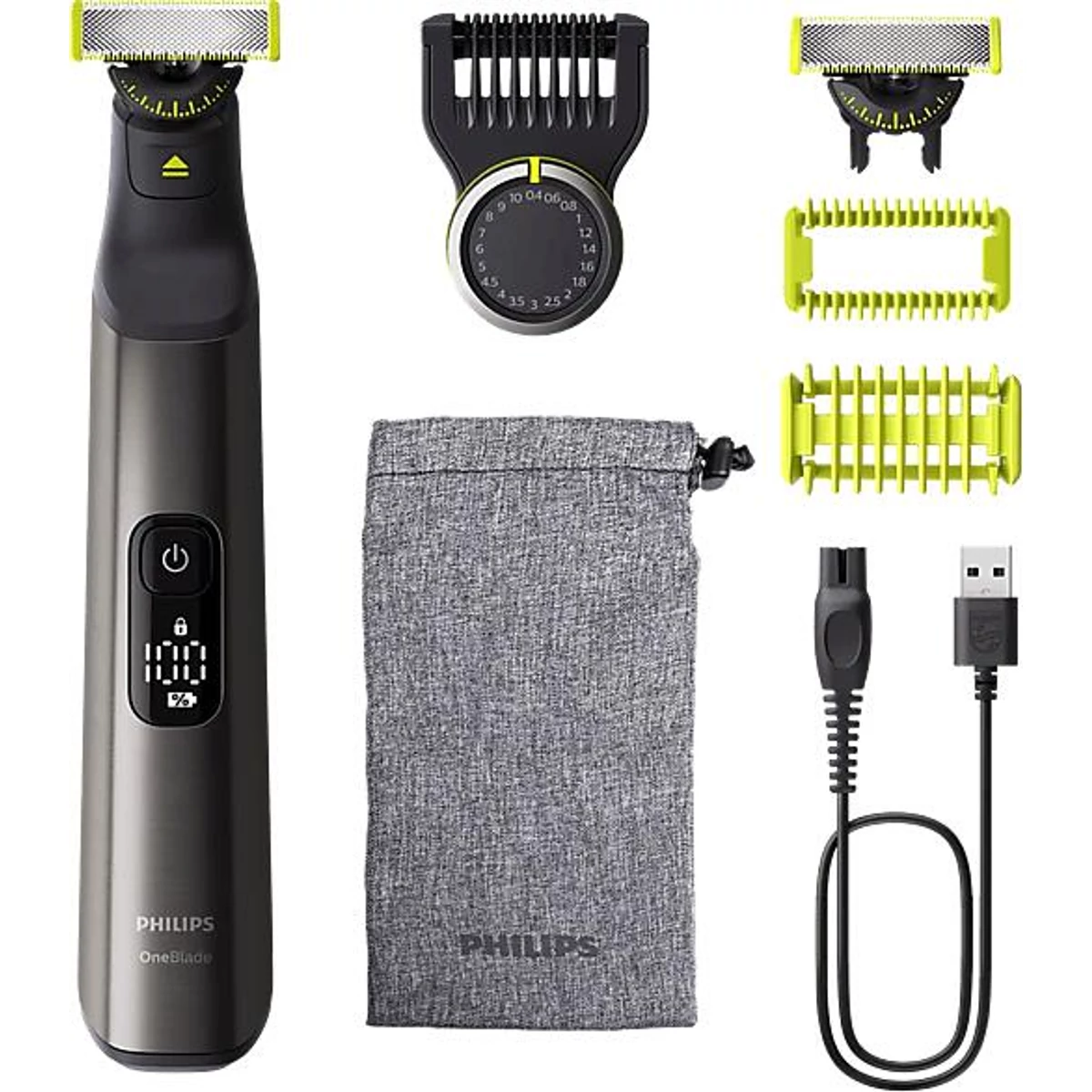 A Philips OneBlade Pro arc + test segítségével bármilyen hosszú szőrzet trimmelhető, formázható és borotválható. Egy archoz való pengét és egy bőrvédővel ellátott, testhez való pengét tartalmaz. Nincs szükség többé megannyi eszközre – a OneBlade-re mindent rábízhatsz.