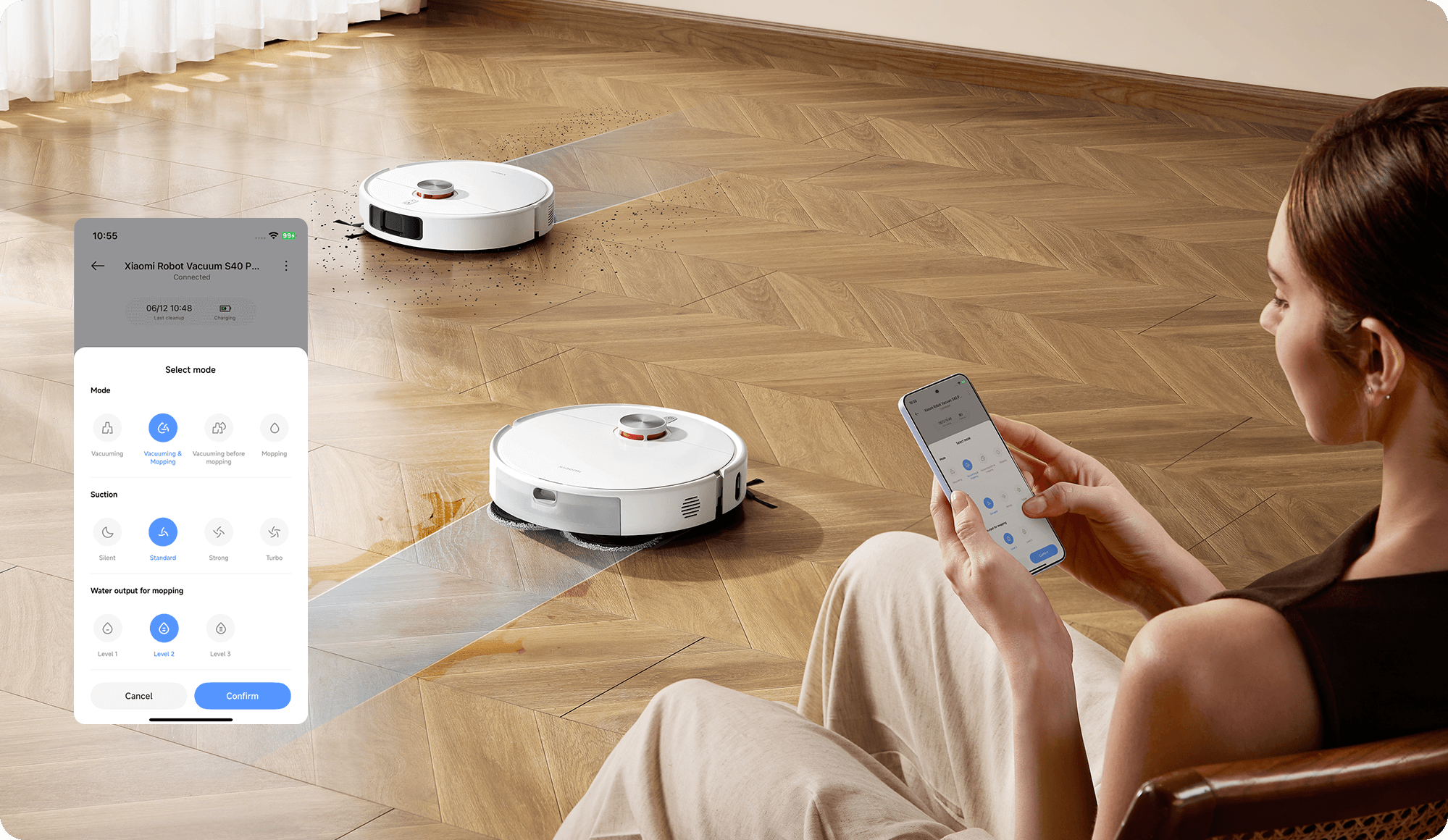 A Xiaomi Home alkalmazással távolról indíthatod el a takarítást, beállíthatod az időzítést, zónákat jelölhetsz ki, vagy megtekintheted a takarítás állapotát.